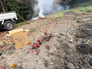 さっそく、葉を熊手で集め、サツマイモを入れて、焼き芋作り。